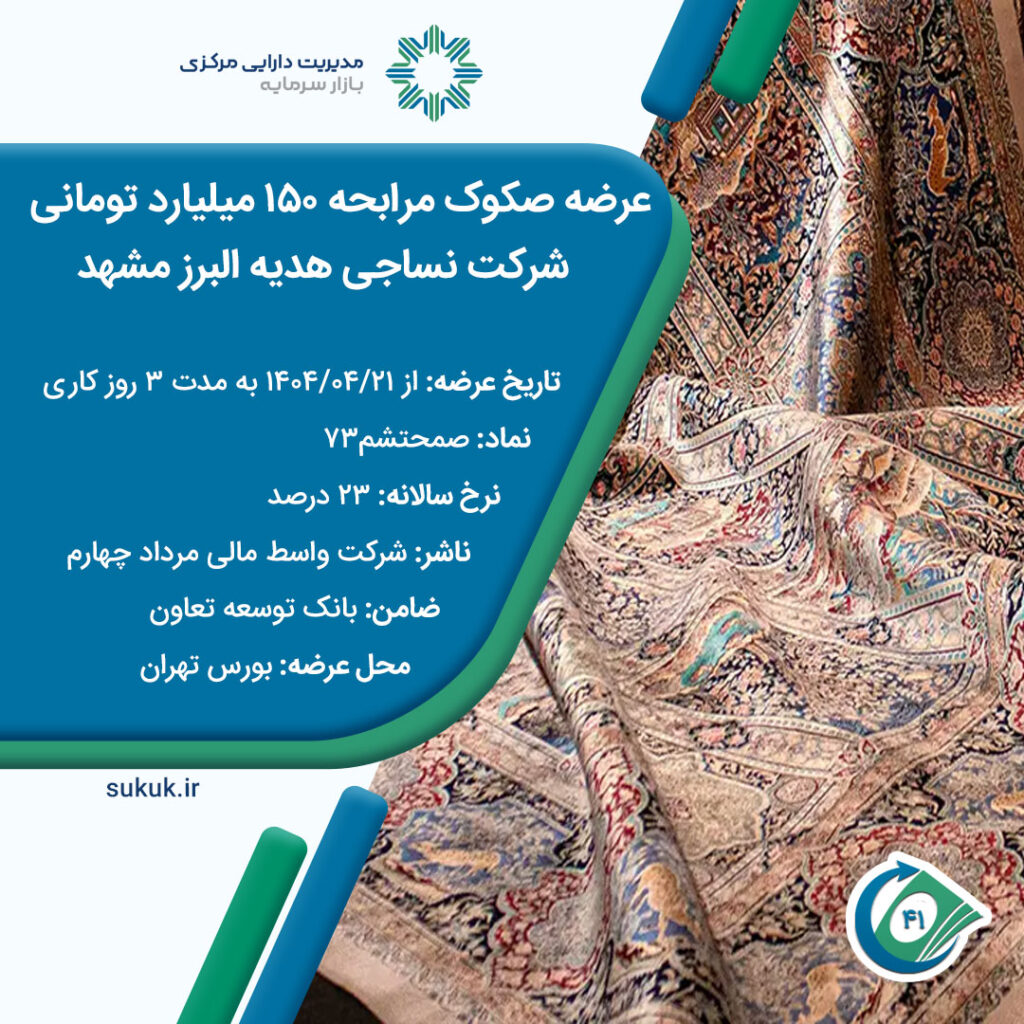 عرضه صکوک مرابحه 150 میلیارد تومانی شرکت نساجی هدیه البرز مشهد